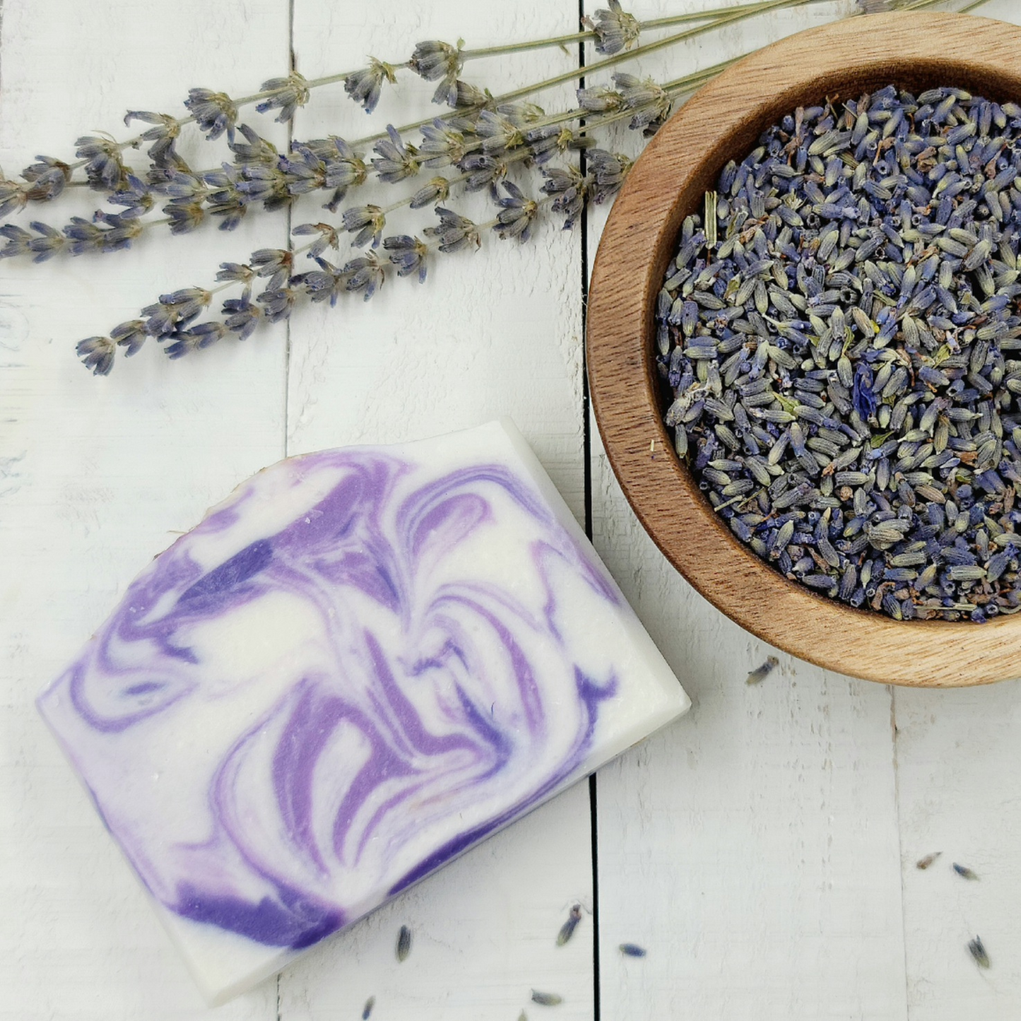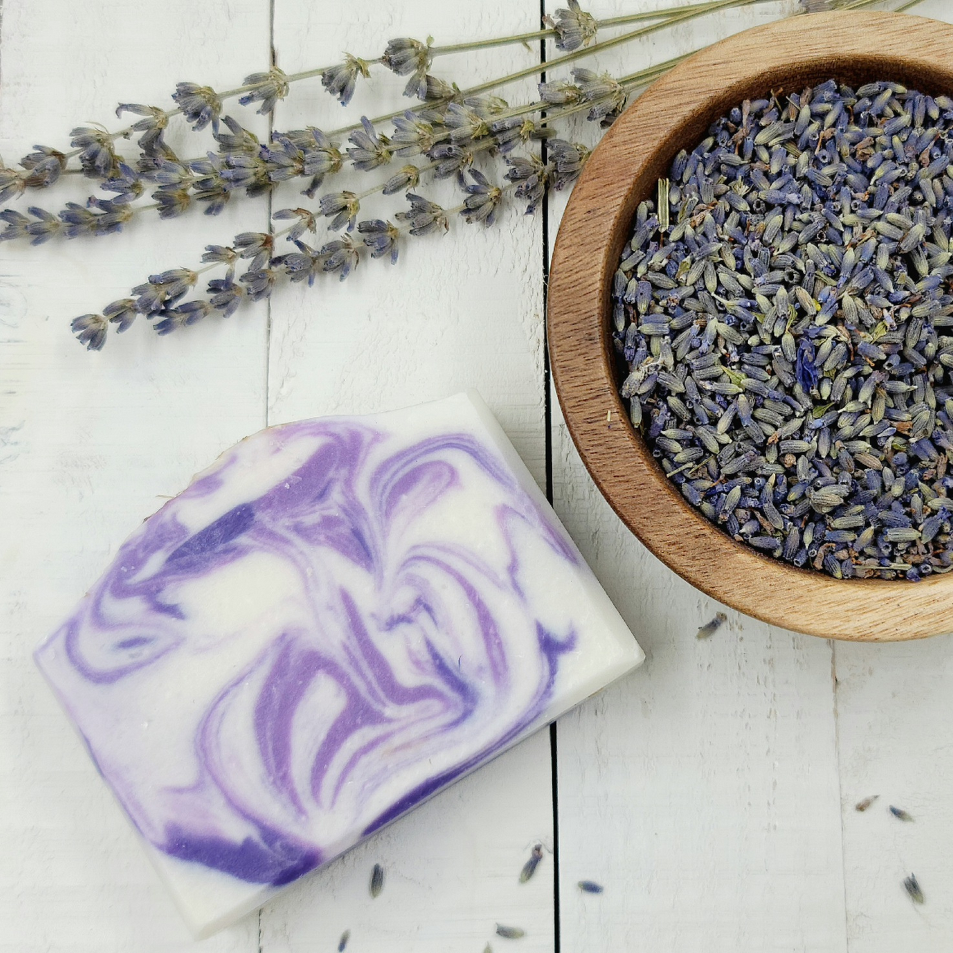 Ingredients: Cocos Nucifera (Coconut) Oil, Olea Europaea (Olive) Oil, Aqua, Persea Gratissima (Avocado) Oil, Butyrospermum Parkii (Shea) Butter, Sodium Hydroxide, Ricinus Communis (Castor) Seed Oil, Lavandula Angustifolia, Titanium Dioxide (CI 77891), Kaolin, Mica, Centaurea Cyanus, Sodium Chloride, Lavendula sp.